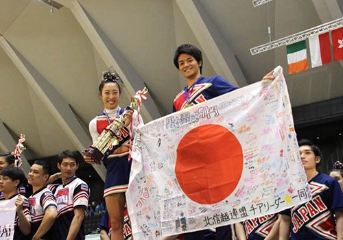 応援団を兼任するチアリーダー部に所属するなか、大学4回生ではチアリーディング世界選手権大会の日本選抜メンバーに選出されます。日本代表キャプテンとしてチームを牽引し、見事世界一位に輝きました。